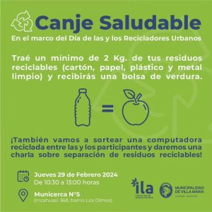 En conmemoración del Día de las y los Recicladores Urbanos, el Municipio de Villa María invita a la comunidad a participar del Canje Saludable, una iniciativa que te permite intercambiar materiales reciclables por frutas y verduras frescas.