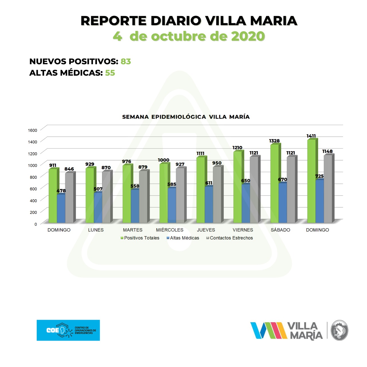 La ciudad de Villa María confirmó 83 nuevos casos positivos de coronavirus en el día de ayer. Además, en nuestra ciudad también se dieron ayer 55 altas médicas. El total de activos es de 686, ya… Un domingo con otros 97 casos en el conglomerado