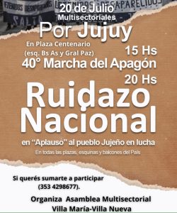 La convocatoria, denominada «40 Marcha del Apagón», se llevará a cabo el próximo jueves 20 de julio a las 15 horas en Plaza Centenario, ubicada en la esquina de Buenos Aires y Gral Paz.