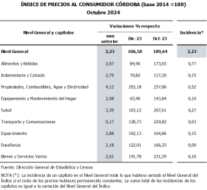 Durante el mes de octubre de 2024, el Índice de Precios al Consumidor Córdoba (IPC-Cba) registró un incremento en su Nivel General de 2,23% respecto al mes anterior.