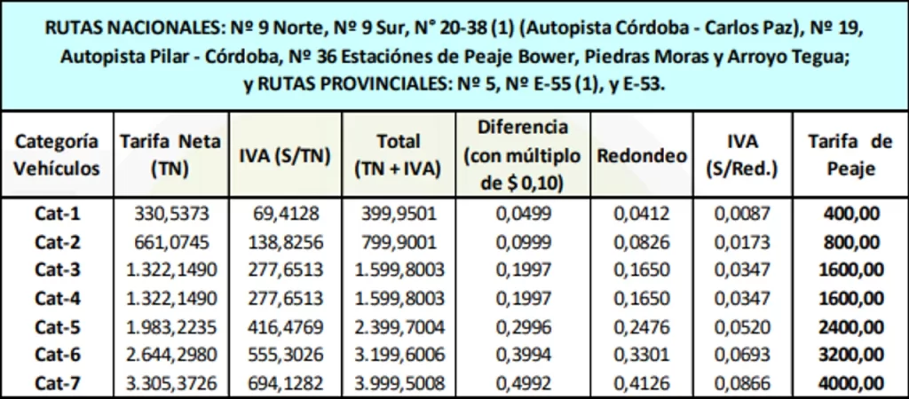 Los nuevos valores impactan en las rutas 9 Norte, 20, 9 Sur, autopistas Córdoba Carlos Paz, Pilar (ruta 19), Bouwer, Piedras Moras, Arroyo Tegua y las rutas provinciales 5, E-55 y E-53.