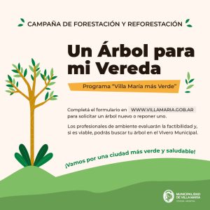 La Municipalidad de Villa María lanzó un nuevo programa de forestación y reforestación llamado: «Un árbol para mi vereda». Se podrá acceder a la adopción de especies a partir del lunes 27 de mayo, completando un formulario que se encuentra disponible en la web www.villamaria.gob.ar.