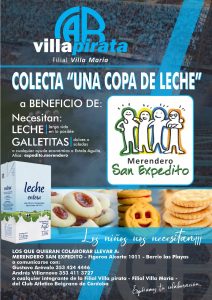 La villa pirata, filial Villa María lleva adelante la colecta «Una copa de leche» a beneficio del Merendero San Expedito. El objetivo es recolectar leche, en lo posible larga vida y galletitas, dulces o saladas.