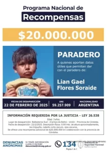 A pocos días de que se cumpla un año de la desaparición del pequeño Lían Gael Flores Soraide, el Gobierno Nacional duplicó la recompensa, como lo hizo el mes pasado, el gobierno de Córdoba. Lo que elevó la recompensa a 40 millones de pesos para quien aporte datos para esclarecer el hecho.