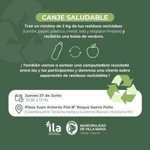 El próximo jueves 27 de junio tendrá lugar la próxima edición de «Canje Saludable» entre las 10.30 y las 13.00 horas. Se llevará a cabo en la Plaza Juan Antonio Fiol de barrio Roque Sáenz Peña, donde se encuentra emplazado el MuniCerca número 1.