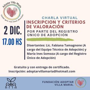 El próximo 2 de diciembre a las 17 horas, se llevará a cabo una charla virtual titulada «Inscripción y criterios de valoración por parte del Registro Único de Adopción». Los disertantes serán la Lic. Fabiana Tamagnone, a cargo del equipo técnico de adopción, y María Inés Somoza, a cargo del Registro Único de Adopción.