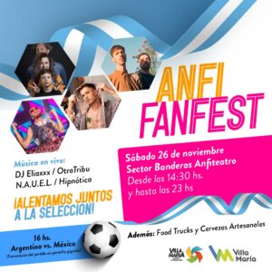La propuesta tendrá lugar en el sector de banderas del Anfiteatro Municipal el próximo sábado desde las 14:30 horas, en la previa del partido, y culminará a las 23 horas. Desde las 16 horas y en pantalla gigante se proyectará el segundo encuentro del seleccionado argentino de fútbol.