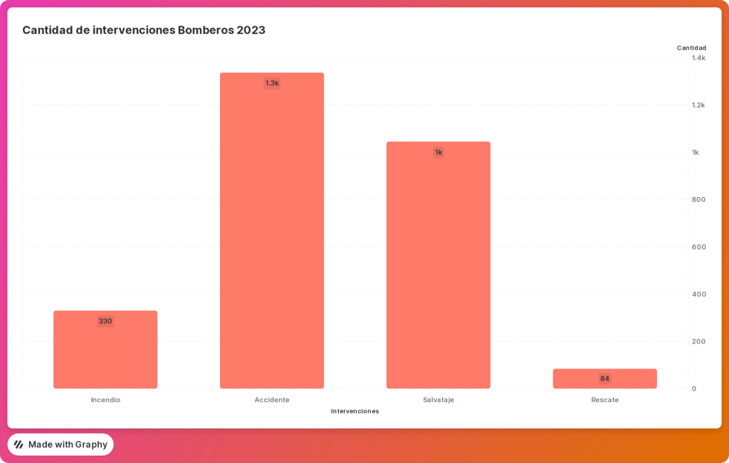 Según el reporte, los tipos de intervención más frecuentes incluyen accidentes, salvamentos e incendios, con un aumento constante en el número de accidentes durante el 2023. Entre los accidentes más comunes se destacan los choques, principalmente entre automóviles y motocicletas, así como entre camiones y motocicletas.