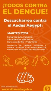 Este martes 27 de febrero se llevará a cabo una importante campaña de descacharreo en varios barrios de nuestra ciudad. La iniciativa, coordinada por las autoridades de salud locales, tiene como objetivo eliminar posibles criaderos de mosquitos y reducir así el riesgo de transmisión de esta enfermedad.