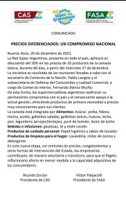 La Cámara Argentina de Supermercados (CAS) y la Federación Argentina de Supermercados y Autoservicios (FASA) emitieron un comunicado conjunto informando que aplicarán un descuento del 20% en los precios de 20 productos de la canasta básica. Esta iniciativa, que durará 60 días, comenzará a regir a partir del miércoles 27 de diciembre.