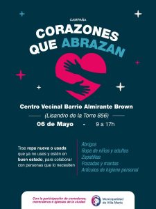 En el marco de la campaña solidaria “Corazones que abrazan”, el próximo miércoles 6 de mayo, en el Centro Vecinal del barrio Almirante Brown (Lisandro de la Torre 856), de 9 a 17 horas, se recibirán donaciones. Podes acercar ropa de niños y adultos, nueva o usada en buen estado; zapatillas; frazadas y mantas; y artículos de higiene personal.